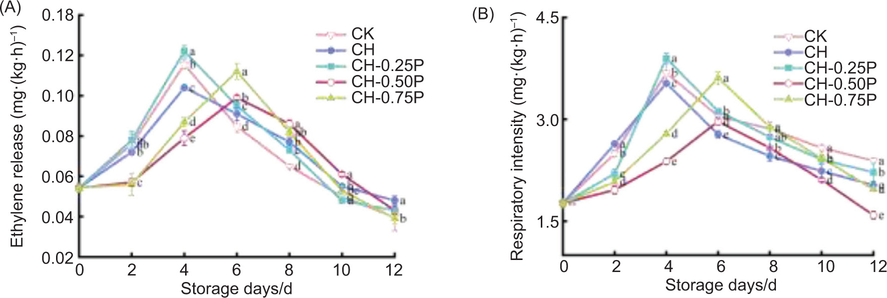 Respiratory climacteric fruits exhibit a respiratory peak during the postharvest ripening process, which signifies the onset of the fruit’s ripening stage. During this phase, the edible quality and economic value of the fruit gradually increase. Therefore, investigating changes in respiratory intensity is one of the key indicators for assessing whether respiratory climacteric fruits have entered the ripening stage (Li et al., 2024). The effects of different concentrations of antimicrobial peptides on ethylene release and respiratory intensity in mangoes during storage are presented in Figure 2a and 2b. In the early stages of storage, all four treatment groups showed an upward trend in both respiratory intensity and ethylene release. The CK, CH, and CH-0.25P treatment groups reached their respective peaks in ethylene release and respiratory intensity on the 4th day. However, compared with the CK group, the CH-0.50P and CH-0.75P treatment groups exhibited a delay of 2 days in reaching their peaks, with reductions of 19.39% and 2.01%, respectively, in respiratory intensity peaks and decreases of 14.31% and 3.06%, respectively, in ethylene release peaks. These results suggest that the CH-0.50P treatment effectively suppresses ethylene release and respiratory intensity in mangoes. As the maturation process progresses, the weakened respiratory climacteric pattern in fruits treated with the antimicrobial peptide PNMGL2 may be attributed to the corresponding deceleration of ethylene release and the associated decline in metabolic activities that drive the maturation process (Chomba et al., 2025).