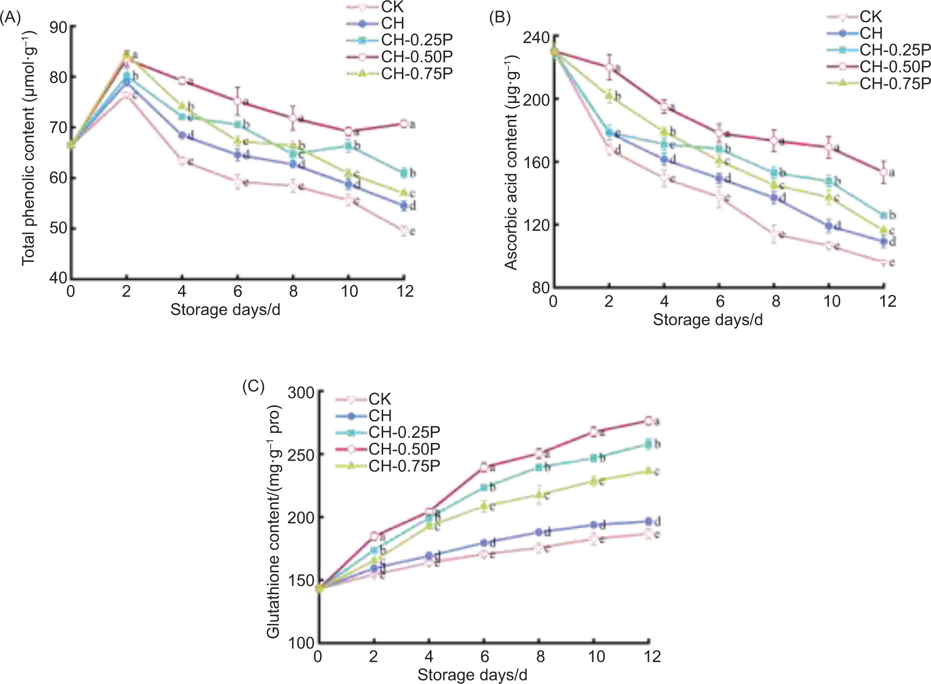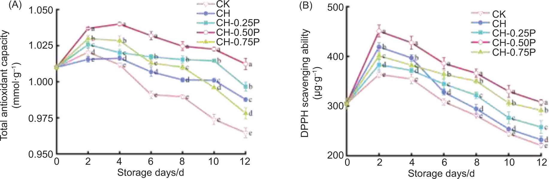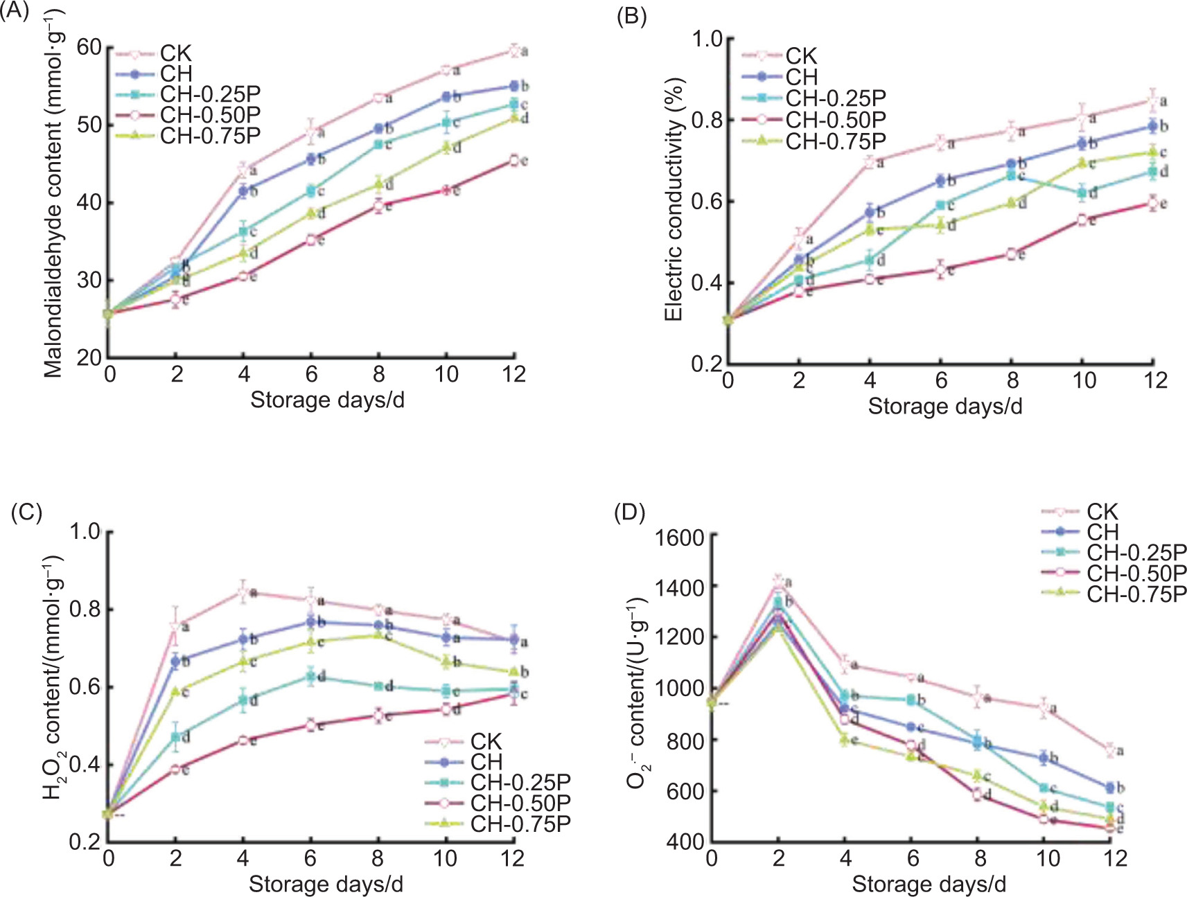 T-AOC reflects the combined effects of various antioxidants and antioxidant enzymes, such as vitamin C, vitamin E, β-carotene, and enzymatic antioxidants. Therefore, it can serve as an effective indicator for evaluating the overall antioxidant capacity of bioactive substances (Pérez-Lamela et al., 2021). On the 2nd day, the total antioxidant capacities of CH-0.25P, CH-0.50P, and CH-0.75P reached their respective peaks at 1.00 mmol/g, 1.01 mmol/g, and 0.98 mmol/g (Figure 6a). At the end of storage, the T-AOC of the CH-0.50P treatment group was significantly higher than that of the CK group (P < 0.05). These results suggest that the CH-0.50P treatment effectively protects cells and tissues from oxidative stress induced by ROS, thereby maintaining fruit quality during storage.