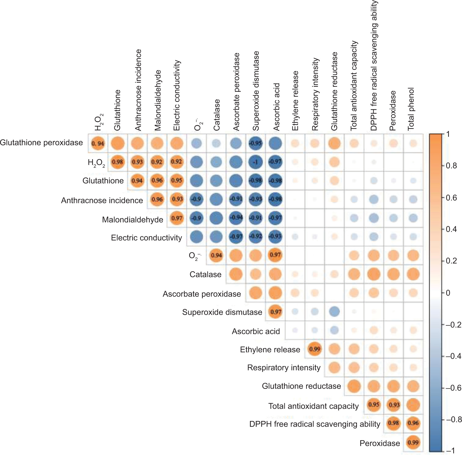 Figure 8. Correlation analysis of mango treated with antimicrobial peptide PNMGL2 during storage. The depth of the color gradation indicates the strength of correlation where 0~1 is positive correlation and –1~0 is negative correlation. The marked value indicates the correlation coefficient, and the absolute correlation coefficient is greater than 0.9.