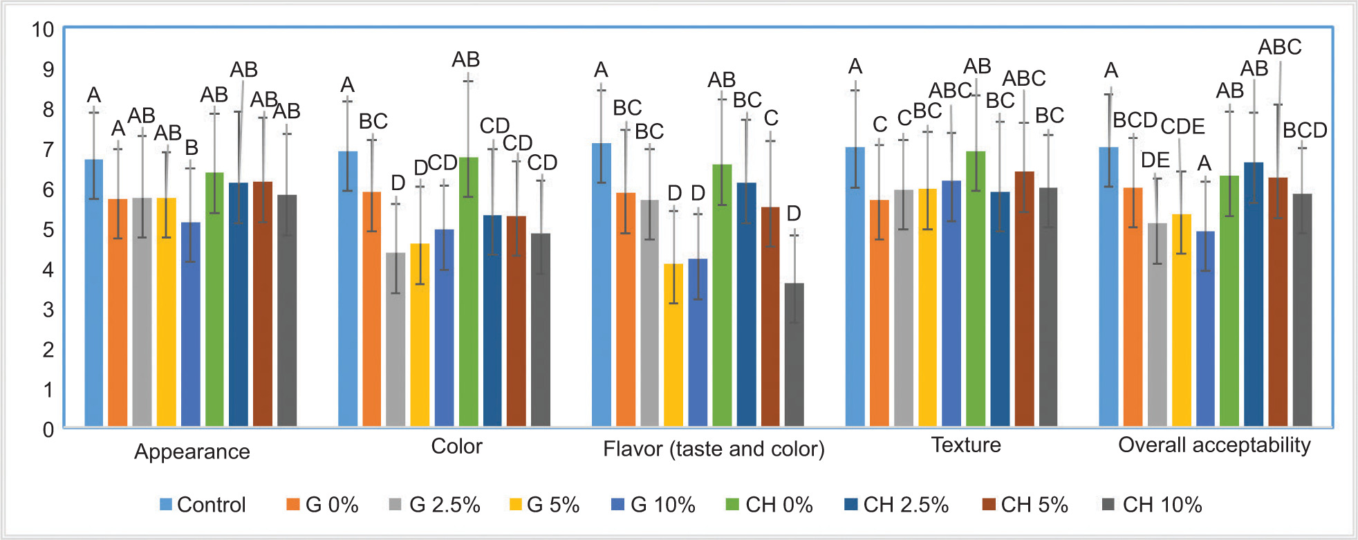 Figure S1. Sensory evaluation of gelatin (G) and chitosan (CH) coatings on Medjool dates without or with different concentrations of PPE (2.5, 5.0, and 10.0%). The values are the average of parameter scores ± standard error. Means with the same uppercase letters are not significantly different (p > 0.05). 1 = dislike extremely; 2 = dislike very much; 3 = dislike moderately; 4 = dislike slightly; 5 = neither like nor dislike; 6 = like slightly; 7 = like moderately; 8 = like very much; 9 = like extremely.