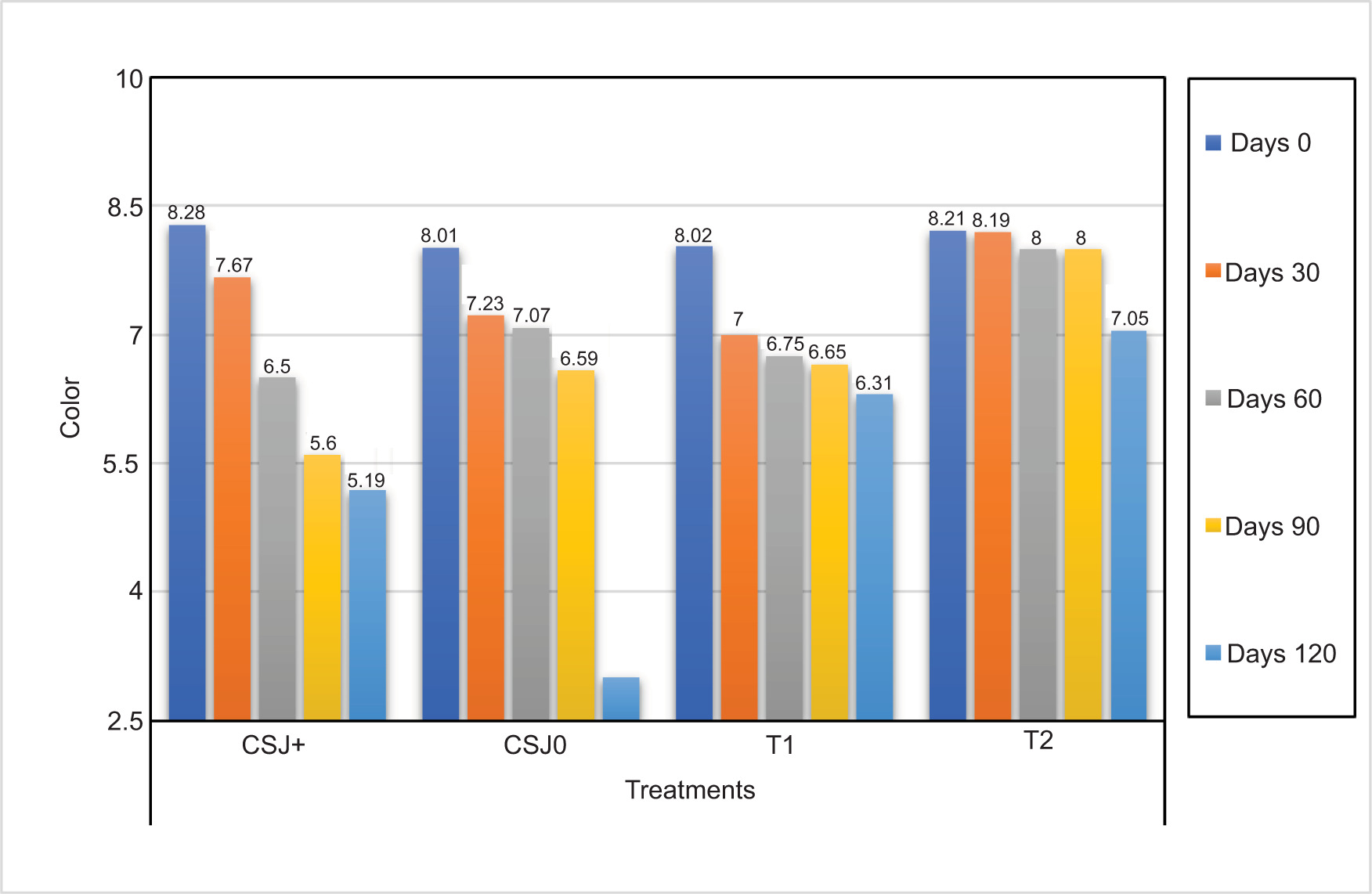 The color values of cantaloupe–sugarcane-blended juice at different storage intervals under CP treatment are presented in Figure 1. On day 0, the highest color value was observed in T2 (8.21±0.20), followed by T1 (8.02±0.08), while the lowest initial color value was recorded for CSJ0 (7.00±0.38). Over the storage, all treatments exhibited a gradual decline in color scores, with the most pronounced decrease observed in CSJ0, reaching the lowest value of 4.70±0.40 on day 120. Similarly, CSJ+ also showed a significant decrease, with the color value reducing to 5.00±0.50 by the end of storage. In contrast, CP-treated samples (T1 and T2) retained significantly higher color values, with T2 maintaining the highest value (7.00±0.22). This decrease could be attributed to the break down of natural pigments, such as carotenoids and anthocyanins. The results indicate that CP treatment, particularly with Ar gas (T2), effectively preserved the color stability of the blended juice, while the untreated controls (CSJ0 and CSJ+) exhibited the most significant losses in color intensity. The results of the study done by Avîrvarei et al. (2023) agree with the present findings showing that CP methods successfully protect colors of fruit-based beverages by reducing their susceptibility to oxidative damage. T2 treatment displayed superior color retention because Ar played a key role in reducing enzymatic browning and pigment decay according to Nath et al. (2022), who showed that noble gases effectively stabilized natural pigments. The color evaluation data also confirmed the results of Umair et al. (2022), who observed major color changes in untreated juice samples during storage. Research done by Zargarchi et al. (2024) confirmed the current findings, which showed that CP improved the stability of carotenoids and polyphenols among fruit juices, thereby delaying browning reactions. According to Xu et al. (2022), non-thermal plasma treatments successfully limit pigment loss within test samples, compared to untreated control samples. The stable reactive environment produced by Ar gas may contribute to polyphenol oxidation limitations, which lead to color preservation. The present findings confirm previous research, which demonstrates the utility of CP as an innovative nonthermal approach to conserve the appearance of fruit-based beverage during storage.