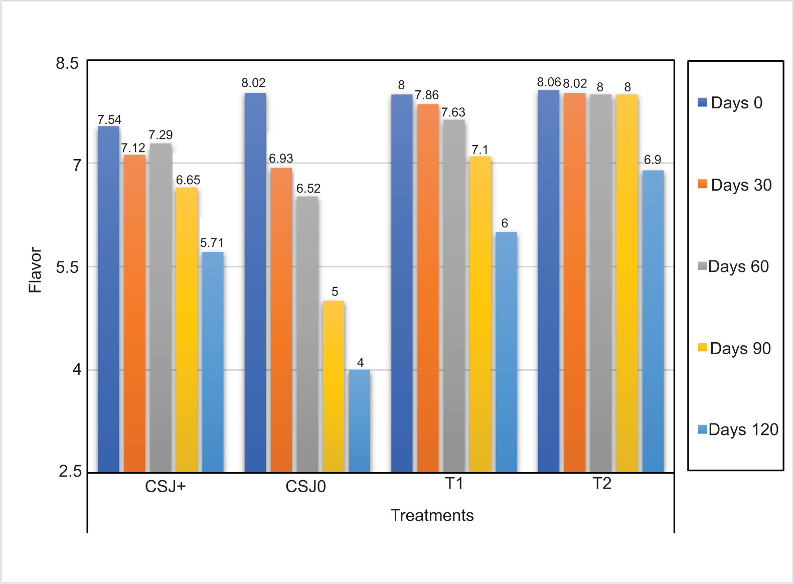 The flavor evaluation of cantaloupe–sugarcane-blended juice at different storage intervals under CP treatment is presented in Figure 2. On day 0, the highest flavor score was observed in T2 (8.20±0.20), followed by T1 (8.00±0.30), while the lowest initial flavor value was recorded for CSJ0 (7.02±0.27). Over storage, all treatments exhibited a gradual decline, with the most pronounced decrease observed in CSJ0, reaching the lowest level of 4.00±0.40 on day 120. Similarly, CSJ+ also showed a significant decrease, with the flavor score reducing to 5.71±0.65 by the end of storage. In contrast, CP-treated samples (T1 and T2) retained significantly higher flavor scores, with T2 maintaining maximum score (7.20±0.30). This reduction is attributed to oxidative degradation of aromatic compounds and increasing acidity levels over time. The results indicate that CP treatment, particularly with Ar gas (T2), effectively preserved the flavor quality of juice, while the untreated controls (CSJ0 and CSJ+) exhibited the most significant losses in sensory acceptability. Previous research showed that CP procedures effectively protected flavor compounds mainly through diminishing microbial actions and preventing oxidative damage (Jiang et al., 2022).