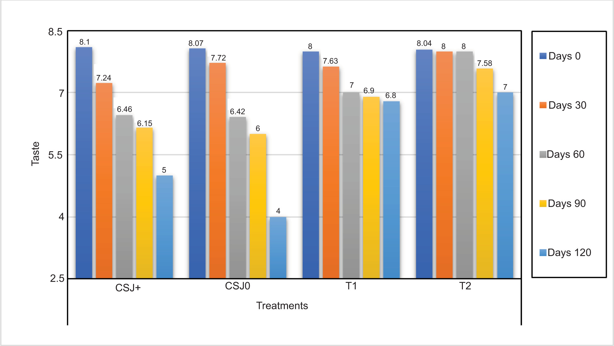 The taste evaluation of blended juice at different storage intervals under CP treatment is presented in Figure 3. On day 0, the highest taste score was observed in T2 (8.10±0.01), followed by T1 (7.95±0.02), while the lowest initial value was recorded for CSJ0 (7.00±0.30). Over storage, all treatments exhibited a gradual decline, with the most pronounced decrease observed in CSJ0, reaching the lowest level of 4.00±0.38 on day 120. Similarly, CSJ+ also showed a significant decrease, with the taste score reducing to 5.00±0.00 by the end of storage. In contrast, CP-treated samples (T1 and T2) retained significantly higher taste scores, with T2 maintaining the highest level (7.00±0.04). This reduction is attributed to oxidative degradation of flavor compounds and increasing acidity levels over time. The results indicate that CP treatment, particularly with Ar gas (T2), effectively preserved the taste quality of the blended juice, while the untreated controls (CSJ0 and CSJ+) exhibited the most significant losses in sensory acceptability.