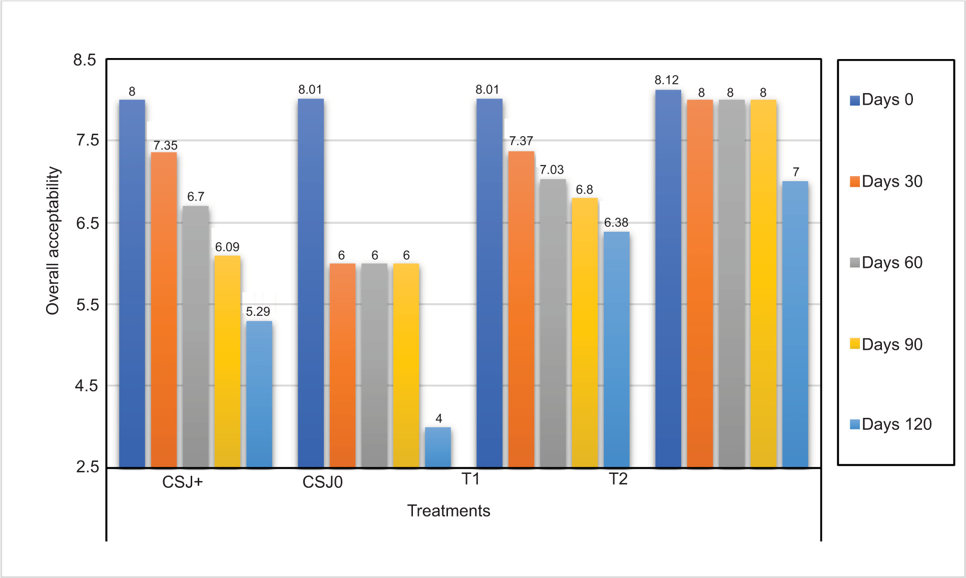According to Korzeniowska et al. (2024), food products respond to CP treatment through modified volatile compounds. The overall acceptability of blended juice at different storage intervals under CP treatment is presented in Figure 4. On day 0, the highest overall acceptability score was observed in T2 (8.12±0.08), followed by T1 (8.01±0.04), while the lowest initial acceptability score was recorded for CSJ0 (7.50±0.15). Over storage, all treatments exhibited a gradual decline, with the most pronounced reduction observed in CSJ0, reaching the lowest level of 4.00±0.05 at day 120. This reduction could be attributed to oxidative degradation, increased acidity, and loss of desirable sensory characteristics over time. The results indicated that CP treatment, particularly with Ar gas (T2), effectively preserved the overall acceptability of the juice, while the untreated controls (CSJ0 and CSJ+) exhibited the most significant losses in sensory appeal. The sensory acceptability of mango juice treated by CP lasted longer than raw juice, thanks to its dual capacity for reducing microorganisms and preserving taste and nutritional elements (Palumbo et al., 2022). According to Zhu et al. (2023), plasma treatment for orange juice resulted in superior protection of color, flavor, and the overall quality, compared to traditional thermal methods. Therefore, the implementation of CP with suitable selection of parameters is important to achieve optimum sensory quality of processed juices.