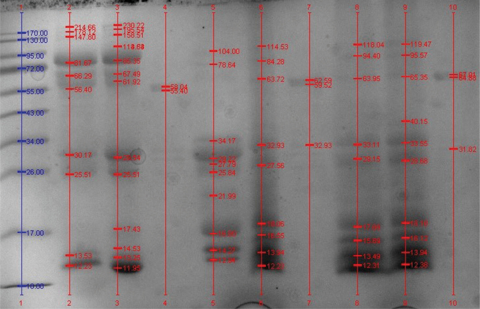 Bands: 1:Marker; 2:Undigested human milk; 3:60. min. gastric digestion of human milk; 4:120. min. gastrointestinal digestion of human milk; 5:Undigested cow milk; 6:60. min. gastric digestion of cow milk; 7:120. min. gastrointestinal digestion of cow milk; 8:Undigested goat milk; 9:60. min. gastric digestion of goat milk; 10:120. min. gastrointestinal digestion of goat milk.
