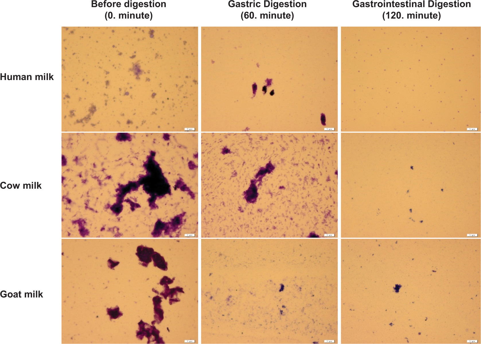 Even though breakdown continues in the cow milk samples taken after 120 minutes, the post-digestion particles have not completely broken down. This finding suggests that cow milk is more difficult to digest after gastrointestinal digestion. In goat milk, the protein particles before digestion are in a more homogeneous state compared with cow milk. After gastric digestion, goat milk samples show a model closer to that of human milk, and by the time gastrointestinal digestion is complete, most of the particles have been digested, with a homogeneous distribution of the remaining particles. This finding supports the idea that goat milk completes the digestion process more efficiently than cow milk and exhibits a digestion profile similar to that of human milk. The data obtained suggest that human milk is the easiest to digest and the most suitable for infant nutrition during the in vitro infant digestion simulation process. Furthermore, in cases of human milk deficiency or unavailability, cow milk, which is commonly preferred for infant formula production, is more difficult to digest compared with human milk and goat milk due to the presence of larger protein particles.