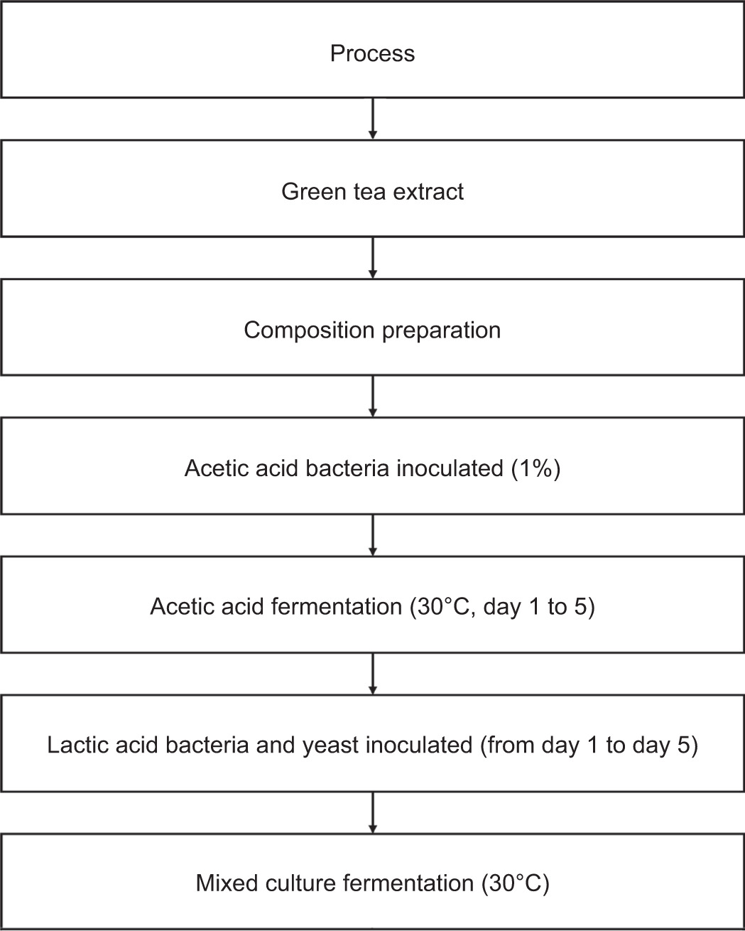 To develop an optimal composition of carbon and nitrogen sources for kombucha production and a mixed starter culture development, we prepared a green tea extract to test for fermentation characteristics. The green tea was prepared by adding 10 g green tea leaves to 1 L of distilled water and extracted at 90°C for 1 h. The extract was then filtered and sterilized at 121°C for 15 min in the autoclave. After the extract was cooled to 30°C, it was used as the fermentation medium (Figure 1).