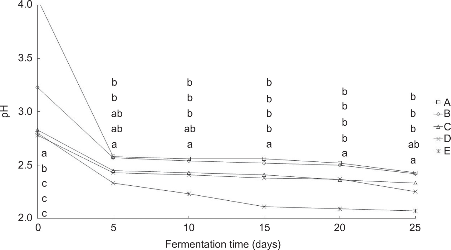 Figure 2. Changes in pH at different inoculation dates of a complex strain. (A) Yeast and lactic acid bacteria were inoculated on day 1 of the acetic acid bacteria culture; (B) Yeast and lactic acid bacteria were inoculated on day 2 of the acetic acid bacteria -culture; (C) Yeast and lactic acid bacteria were inoculated on day 3 of the acetic acid bacteria culture; (D) Yeast and lactic acid -bacteria were inoculated on day 4 of the acetic acid bacteria culture; (E) Yeast and lactic acid bacteria were inoculated on day 5 of the acetic acid bacteria culture. All values are mean ± SD (n = 3).