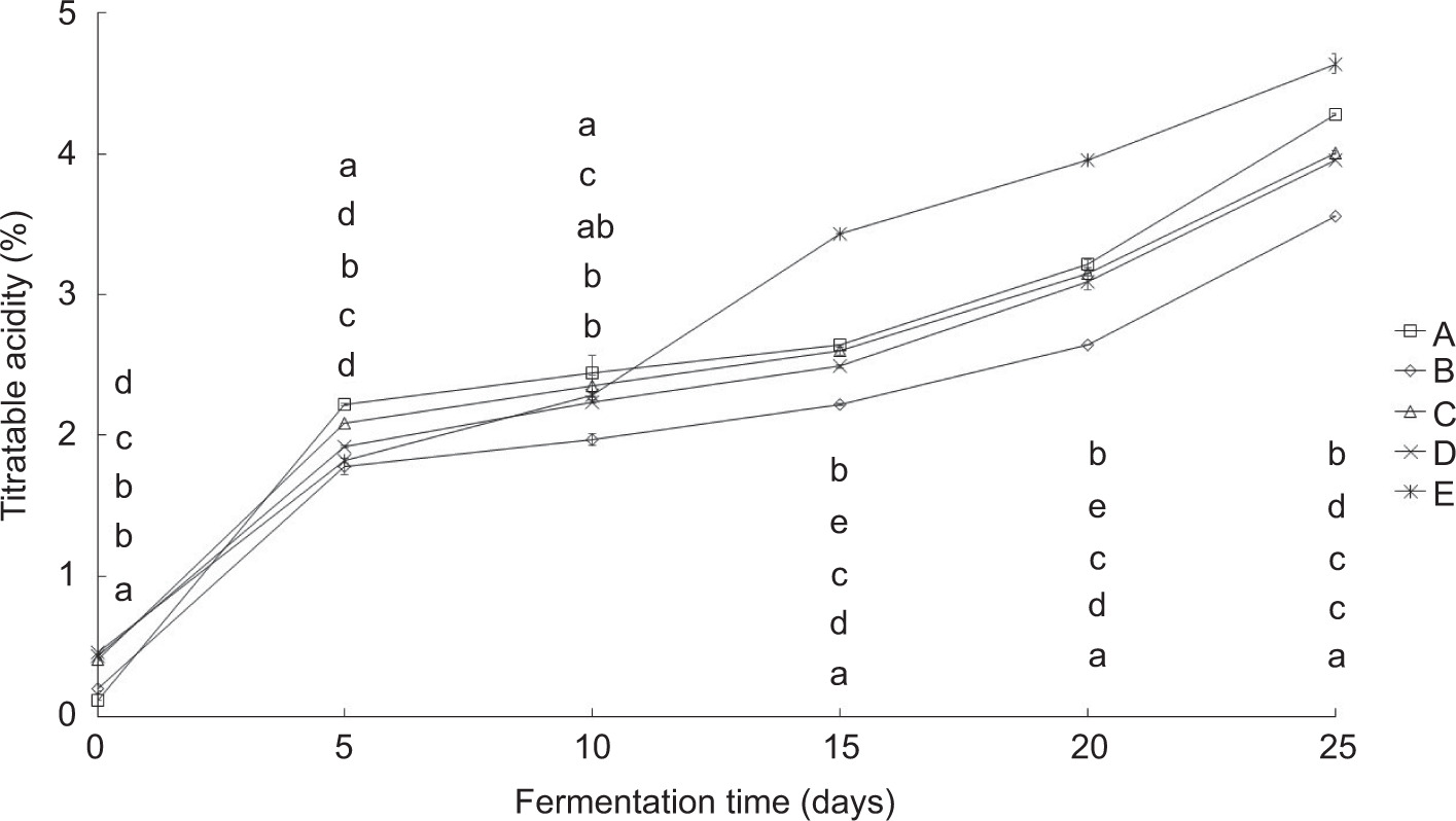 Figure 3. Changes in titratable acidity at different inoculation dates of a complex strain. Detailed sample information is -provided in Figure 2. All values are mean ± SD (n = 3). Means followed by the different lowercase letters at the same fermentation time (day) are significantly different (p<0.05, a>b>c>d>e).