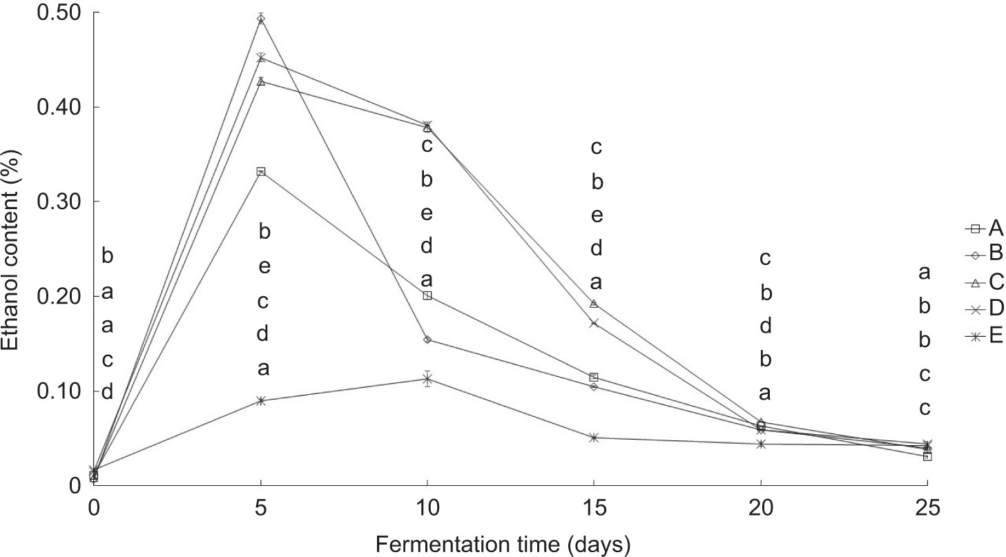 Figure 4. Changes in ethanol content at different inoculation dates of a complex strain. Detailed sample information is provided in Figure 2.