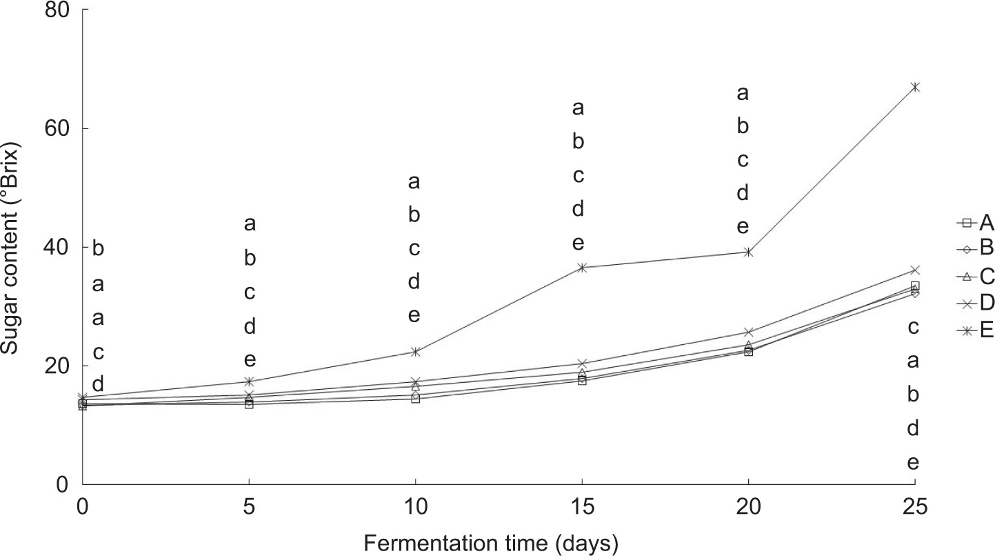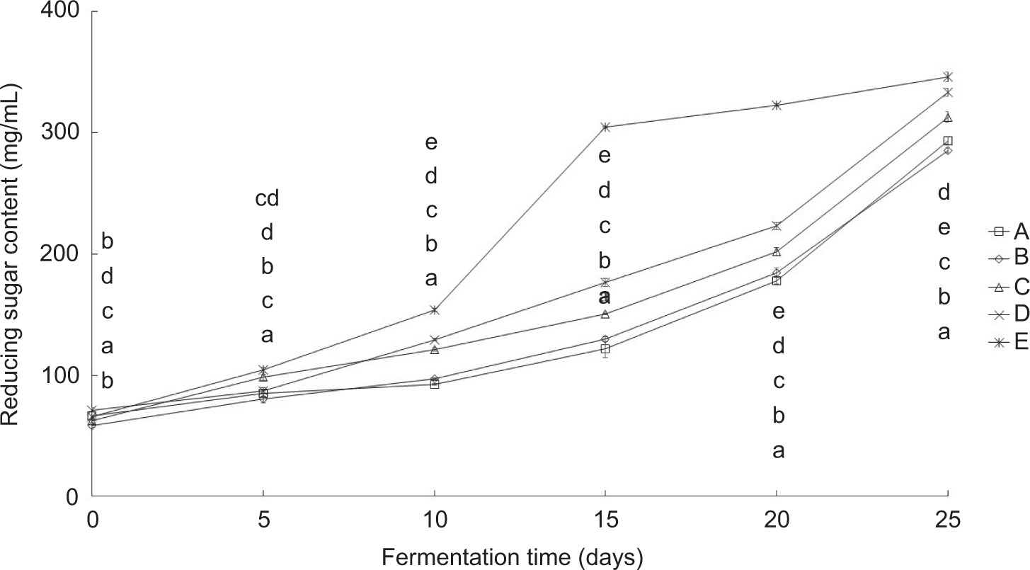 Figure 6. Changes in the reducing sugar content at different inoculation dates of a complex strain. Detailed sample -information is provided in Figure 2. All values are mean ± SD (n = 3). Means followed by the different lowercase letters at the same -fermentation time (day) are significantly different (p<0.05, a>b>c>d>e).