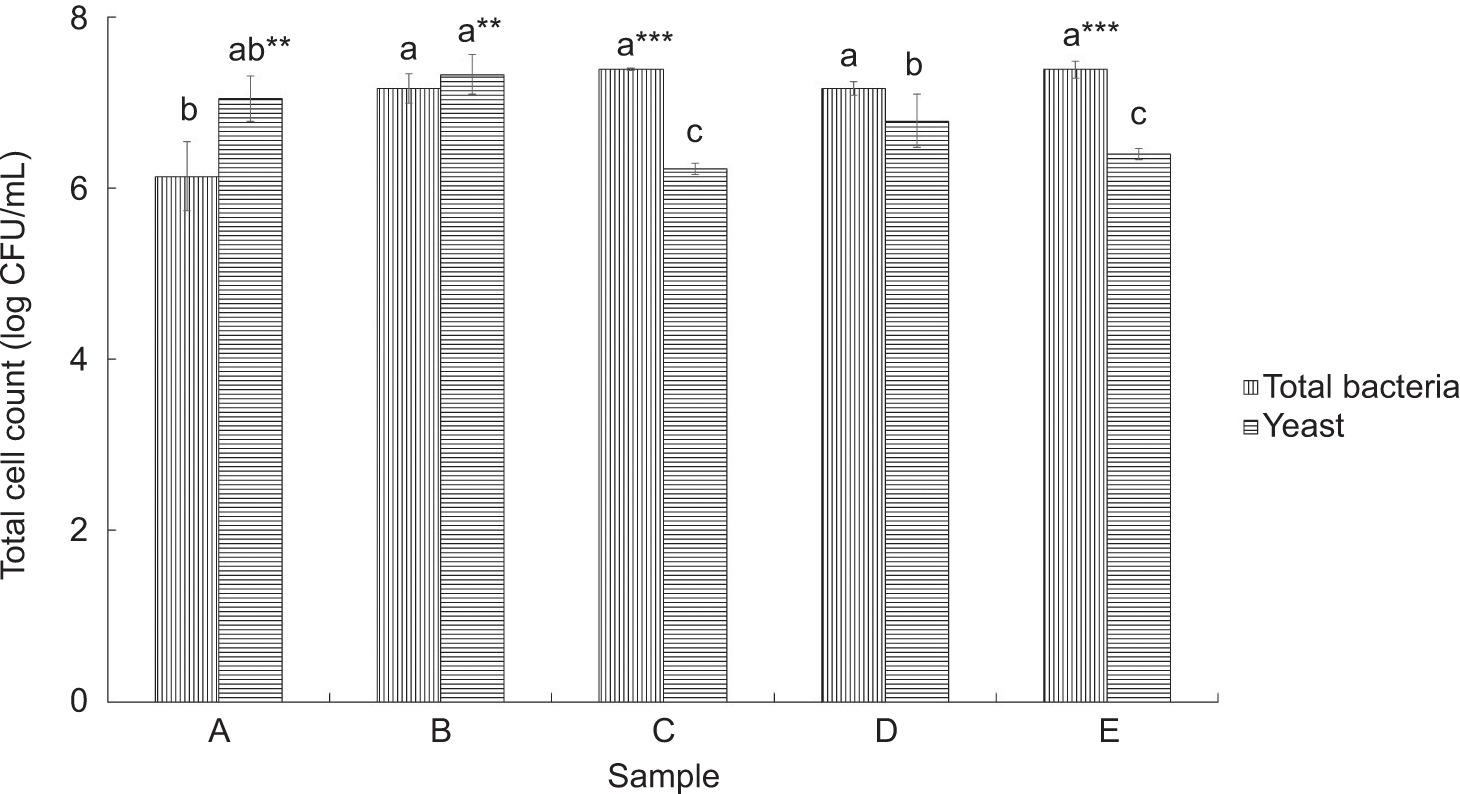 Figure 7. Effect of inoculation dates of complex strains on initial total bacterial and yeast counts. Detailed sample information is provided in Figure 2. All values are mean ± SD (n = 3). Means followed by the different lowercase letters at the same bar are significantly different (p<0.05, a>b>c). Significant difference between bacteria and yeast of same sample by t-test. *p<0.05, **p<0.01, ***p<0.001.