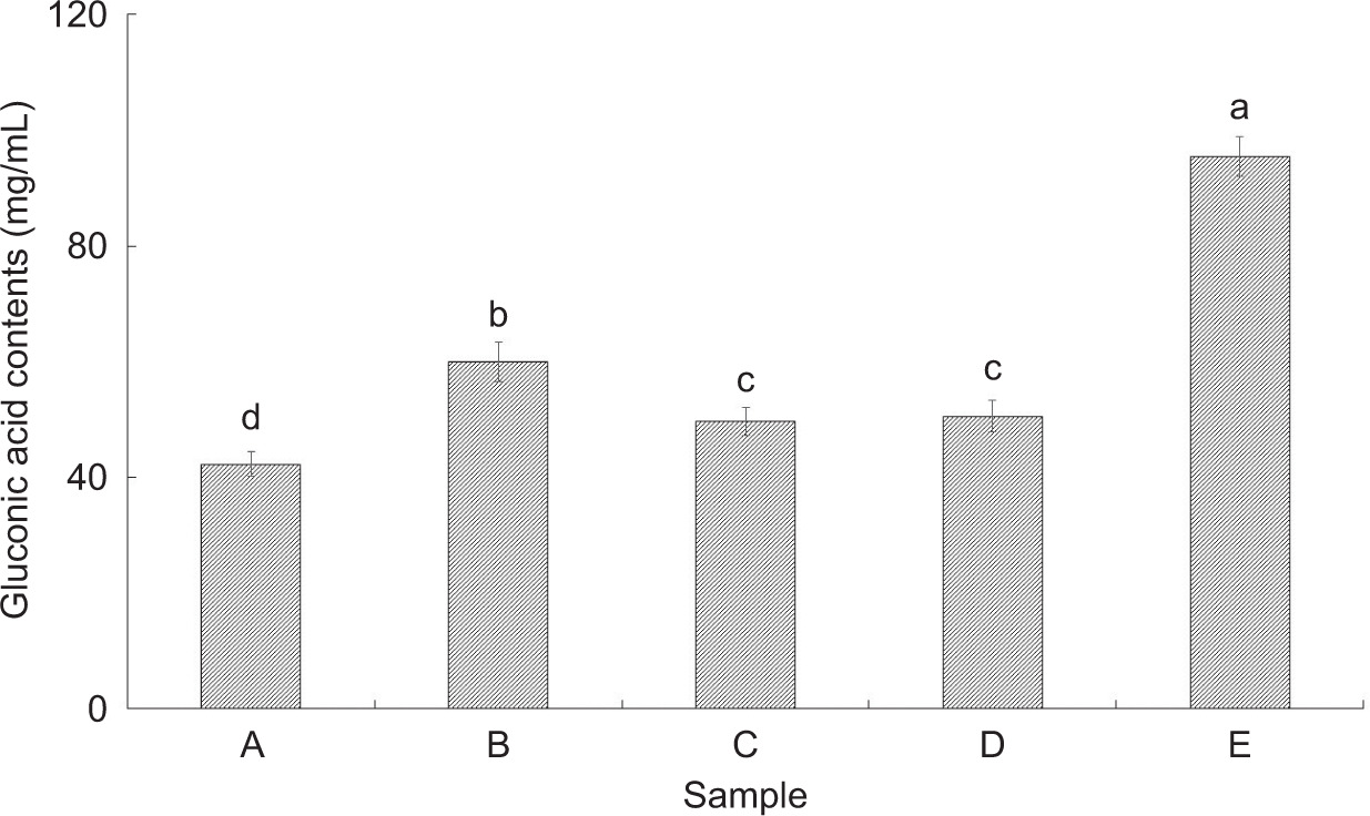 Gluconic acid was analyzed following the method of Ansari et al. (2019). The fermentation broth was centrifuged (1000 rpm, 3 min; HA-1000-3, Hanil Science Industrial Co., Incheon, Korea), and the supernatant was filtered through a 0.45 μm PVDF membrane (25 mm, Chromdisc, Daegu, Korea). The filtrate was analyzed using HPLC (Waters 1525 and 717, Waters Co., Milford, MA, USA) with a Supelcogel C-610H column (30 cm × 7.8 mm, Supelco, Bellefonte, PA, USA). The column oven was maintained at 30°C; the mobile phase was 0.1% phosphoric acid with a flow rate of 0.6 mL/min. A UV detector was used for the detection (Waters 996) at 210 nm. Sodium gluconate (Sigma-Aldrich, St. Louis, MO, USA) was used as the standard, and the quantitation was done using the external standard method.