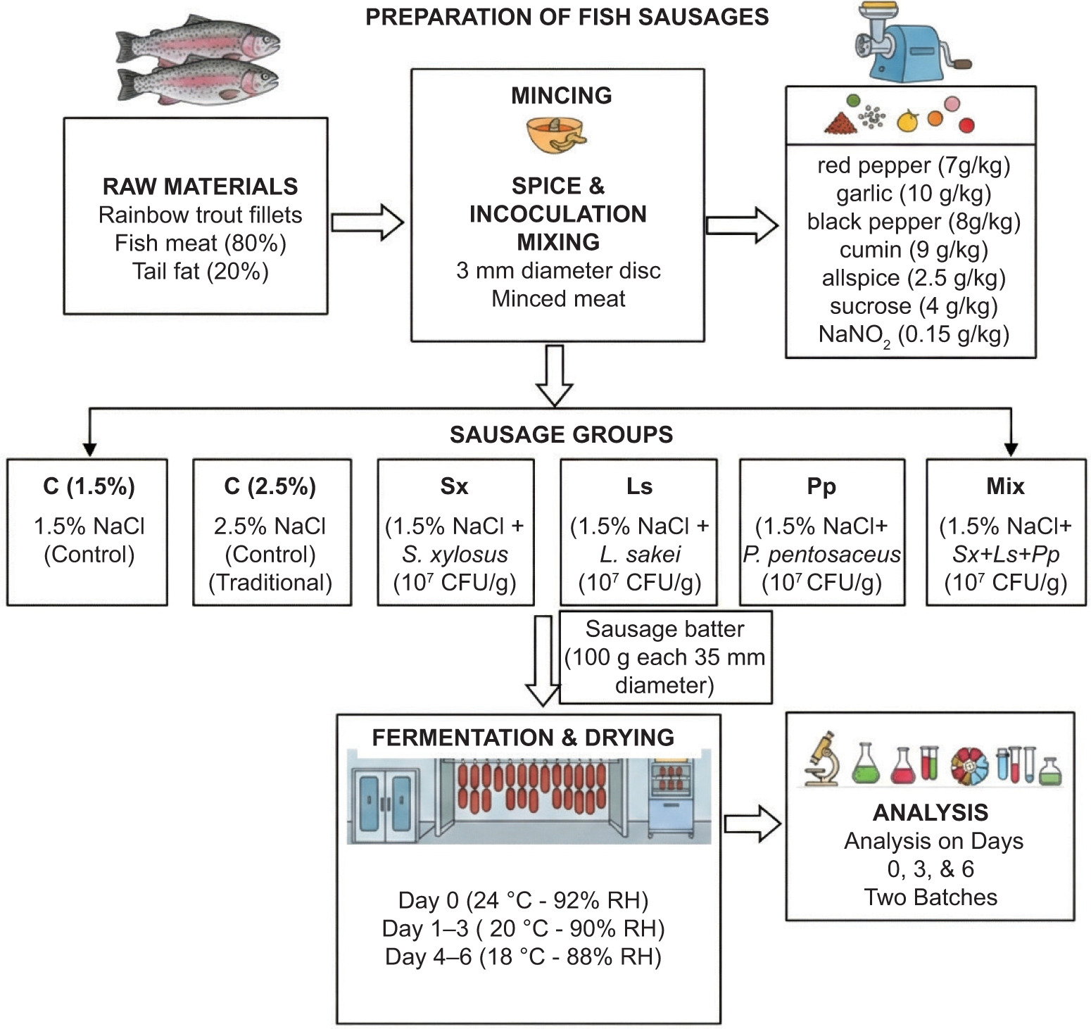 In Turkey, fermented fish sausages are not traditional; however, there is an increasing interest in developing healthier, fish-based alternatives to meat sausages using local species such as rainbow trout (Kılınç and Çaklı, 2021; Kahraman Yılmaz and Berik, 2022). Food preservation through fermentation, an ancient technique, has been shown to enhance both flavor and nutritional (Afifah et al., 2023; Kuley et al., 2018; Mu et al., 2023; Sun et al., 2020; Zang et al., 2020). Fermented sausages are produced from meat and fat mixtures with spices, sugar, salt, and curing agents, then filled into casings and subjected to microbial fermentation. Their long shelf life is due to low water activity (0.7–0.8), low pH (4.5–5.5), and high salt content (Lücke, 2003; Janković et al., 2017; Sadeghi et al., 2021; Sallan et al., 2023).
