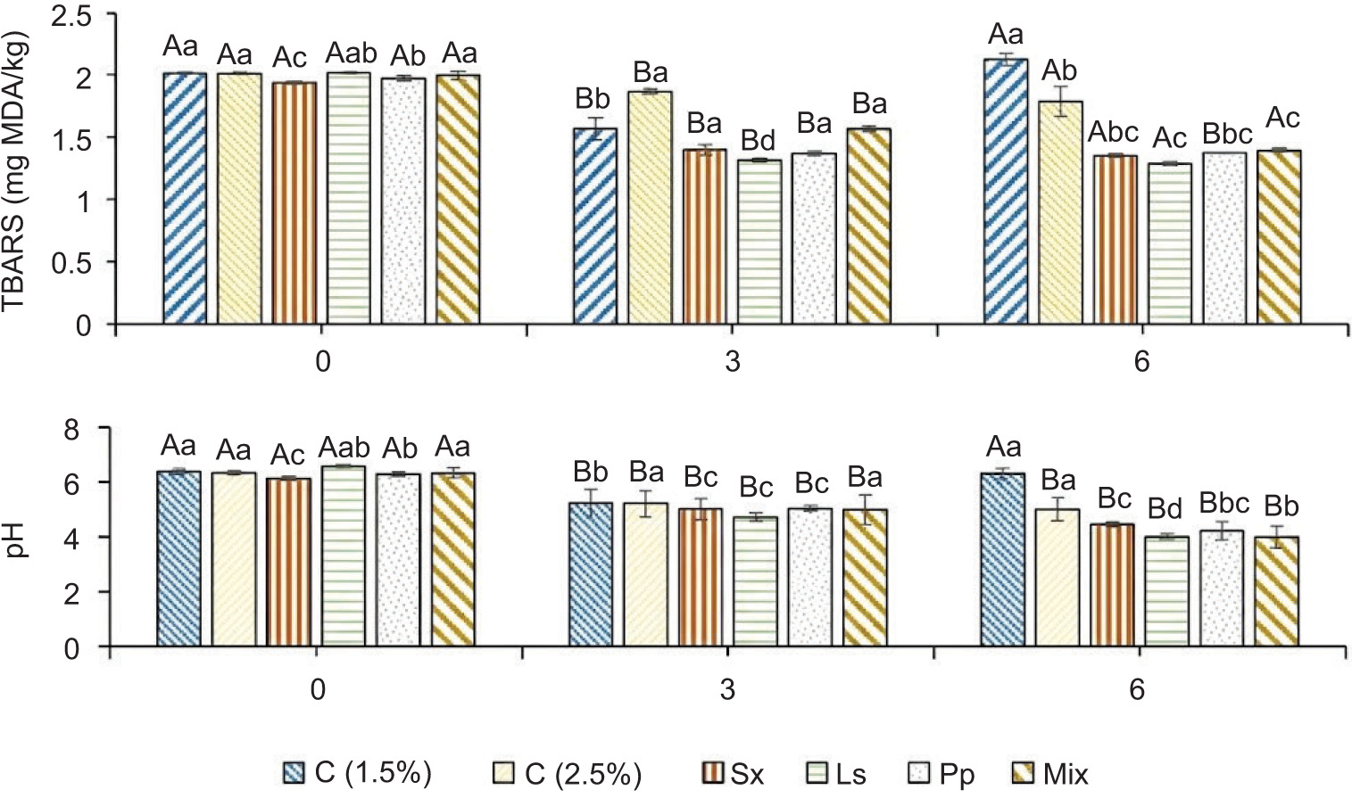 The results of pH and TBARS analyses during fermentation and storage are presented in Figure 2.