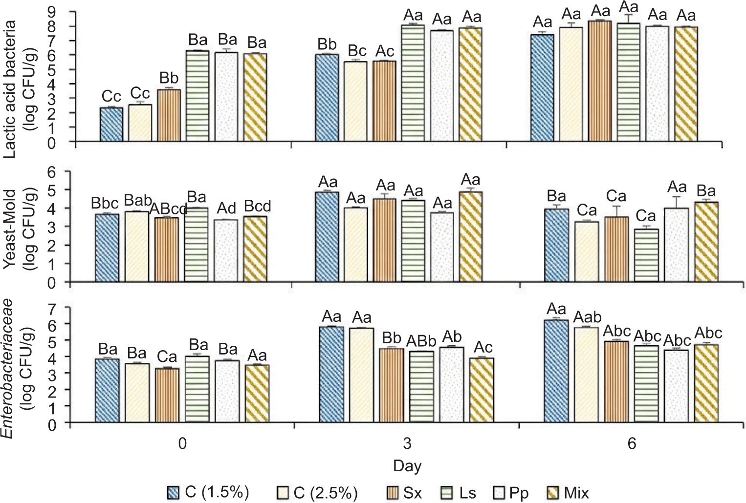 At the final stage (day 6), lactic acid bacteria counts ranged from 8.18 to 8.48 log CFU/g in the inoculated groups, whereas Enterobacteriaceae counts were significantly lower than in the control. These results confirm that the product was microbiologically stable and safe at the end of the fermentation period.