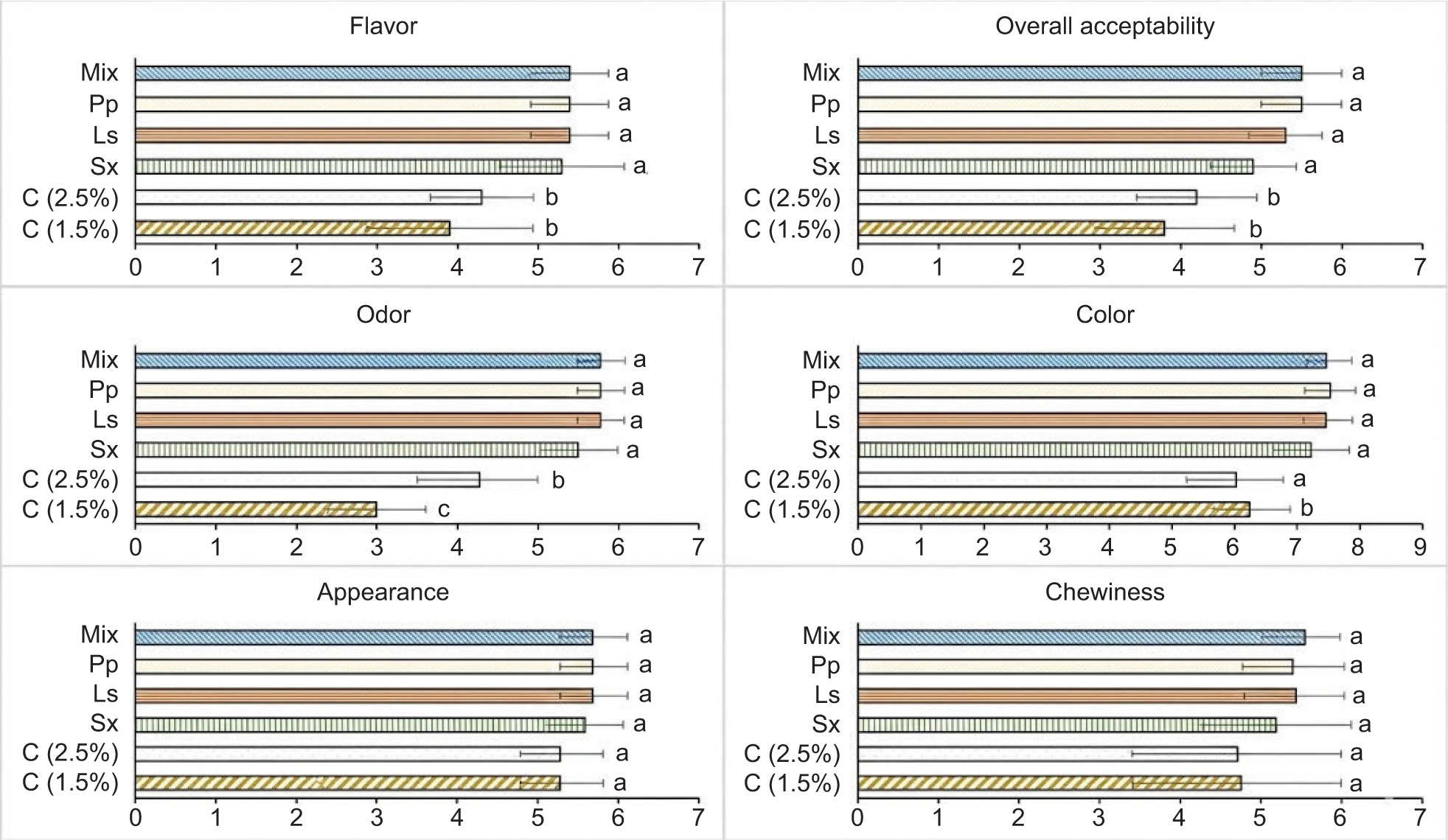 Figure 4. Sensory evaluation of the fish sausages with/without starter culture. C (1.5%): Sausage without starter culture -containing 1.5% salt; C (2.5%): sausage without starter culture containing 2.5% salt; Sx: sausage with S. xylosus; Ls: Sausage with L. sakei subsp. sakei; Pp: Sausage with P. pentosaceus; Mix: sausage with mixed starter culture (S. xylosus, L. sakei subsp. sakei, P. pentosaceus). *Values represent mean ± standard error (n:10). Different lowercase letters (a, b, c) indicate significant differences among groups (p<0.05). Statistical analyses were performed using one-way ANOVA followed by DUNCAN post hoc test.