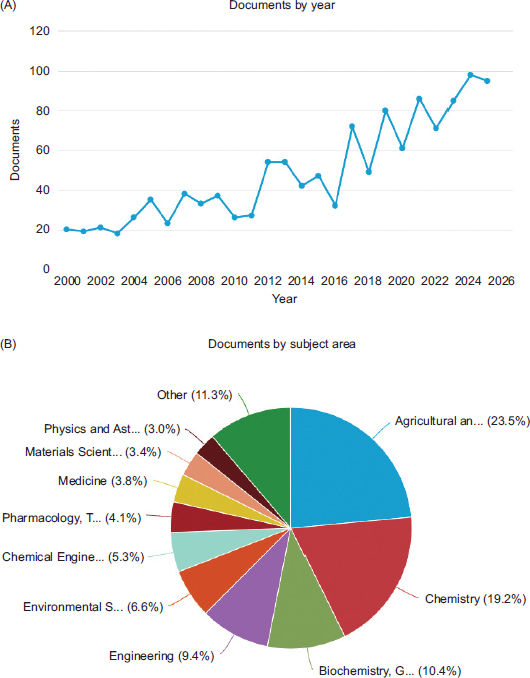 As illustrated in Figure 1A, publications from 2000 to approximately 2015 were relatively limited and showed modest fluctuations, reflecting the exploratory and developmental stage of microwave applications in this field. In contrast, a pronounced and sustained increase in research output is observed from 2016 onward, with clear peaks in the most recent years (2024–2026), indicating a growing scientific and industrial interest in microwave-based processing technologies.