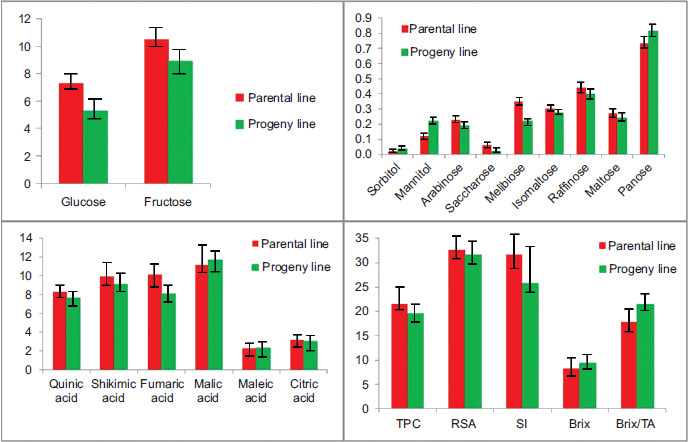 Figure 1 Mean values of the content of sugars (g/100 g), organic acids (mg/kg), TPC (mg GAE/g fw), RSA (mmol TE/100 g fw), SI, Brix (°), and Brix/TA with four experimental blocks (plots) for each sample of parental line and progeny line.