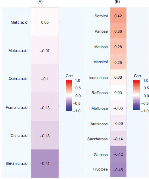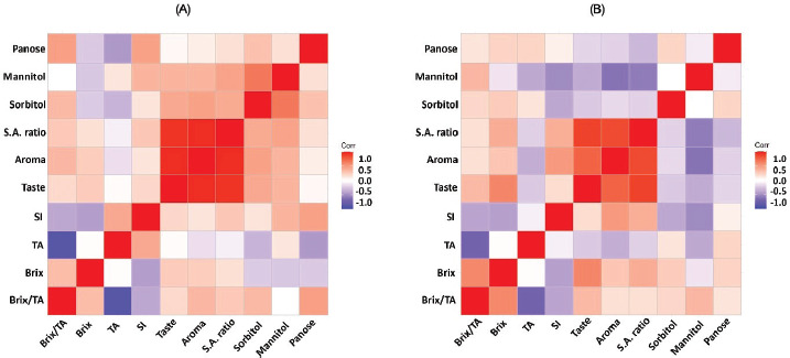 Figure 4 Heatmaps—correlation of the content of panose, sorbitol, mannitol, Brix, the ratio of Brix/TA, SI, and TA, and -sensory analysis parameters (taste, aroma, sugar/acidity ratio [S.A.]) in progeny line samples (A) and parental line samples (B).