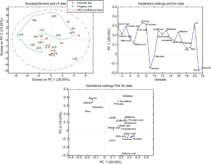 Based on the obtained results on the scores plot (Figure 3A), a completely clear separation of the progeny line from the parental line cannot be observed, but it can be noted that the progeny samples were grouped predominantly in the negative part along the PC1 axis, that is, the positive part along PC2 axes. It can be concluded that the main factors influencing the separation of the progeny line from the parental line along the PC1 axis are sorbitol, mannitol, Brix, and the Brix/TA ratio (Figure 3B and 3C), which is in accordance with the obtained and previously explained results.