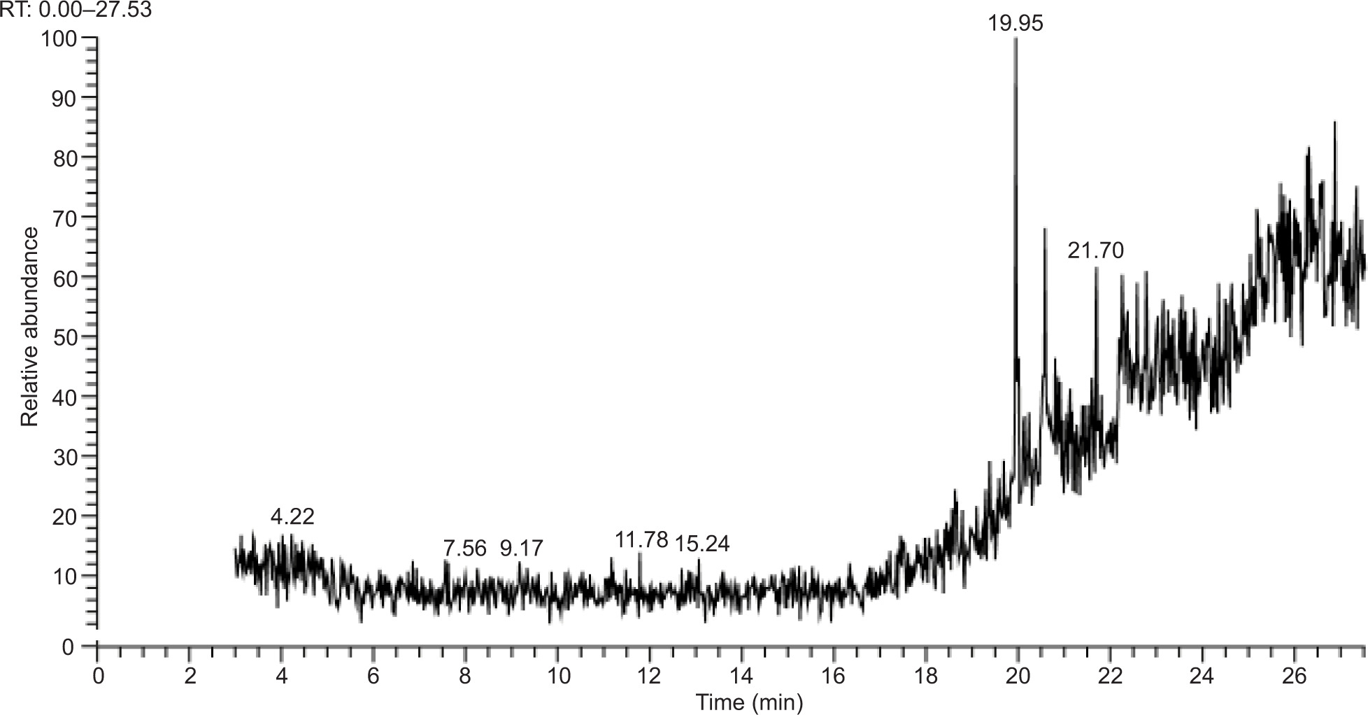 Figure 1. GC-MS chromatogram of the cones of P. wallichiana Pw.Cme.