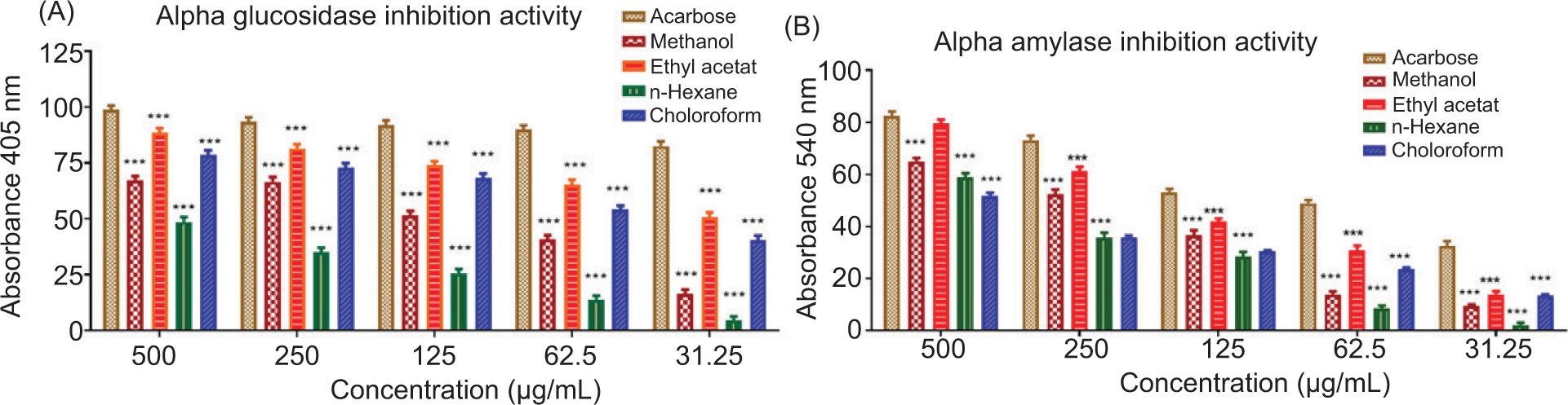 Figure 2. Inhibition of (A) α-glucosidase and (B) α-amylase activity at 500 µg/mL. The fraction at 500 µg/mL exhibited 88.56% inhibition. At 250, 125, 62.5, and 31.25 µg/mL, the response of these concentrations was also seen, that is 81.52%, 73.93%, 65.43%, and 60.90%. The standard acarbose IC50 value was recorded as 2.0 µg/mL. As compared to methanol and n-hexane fraction, chloroform extract showed the highest %inhibition.