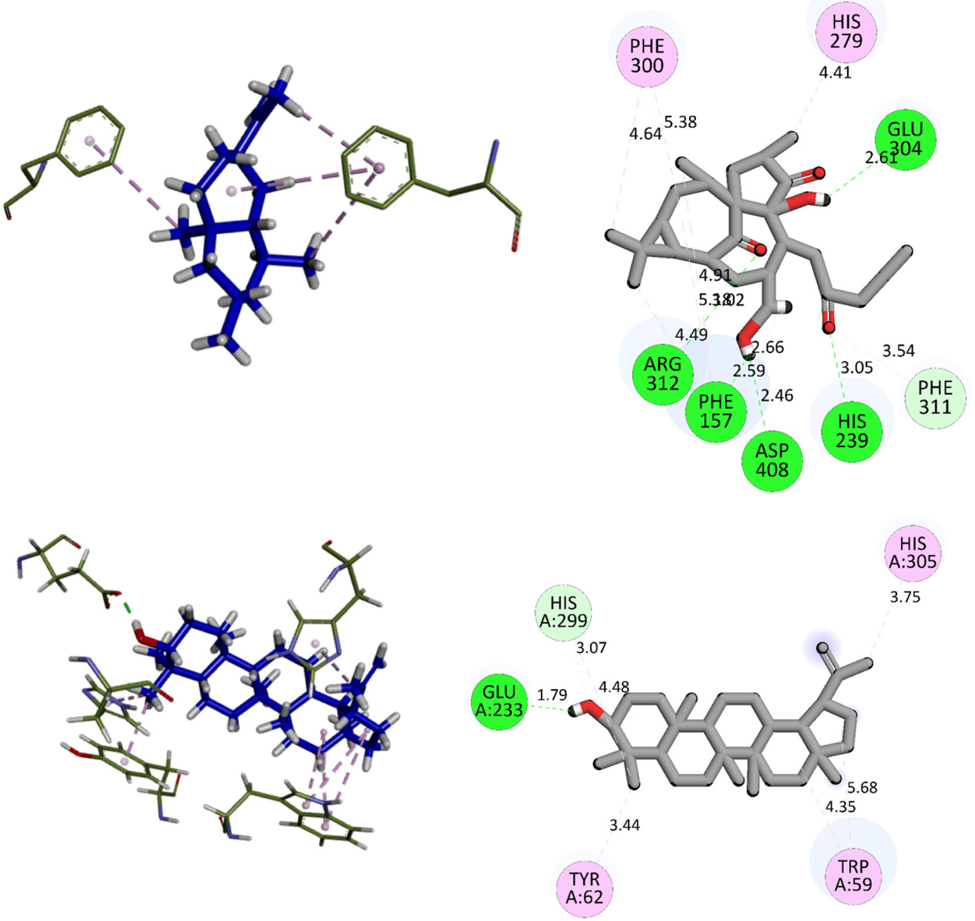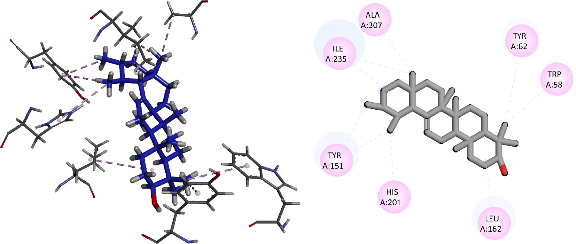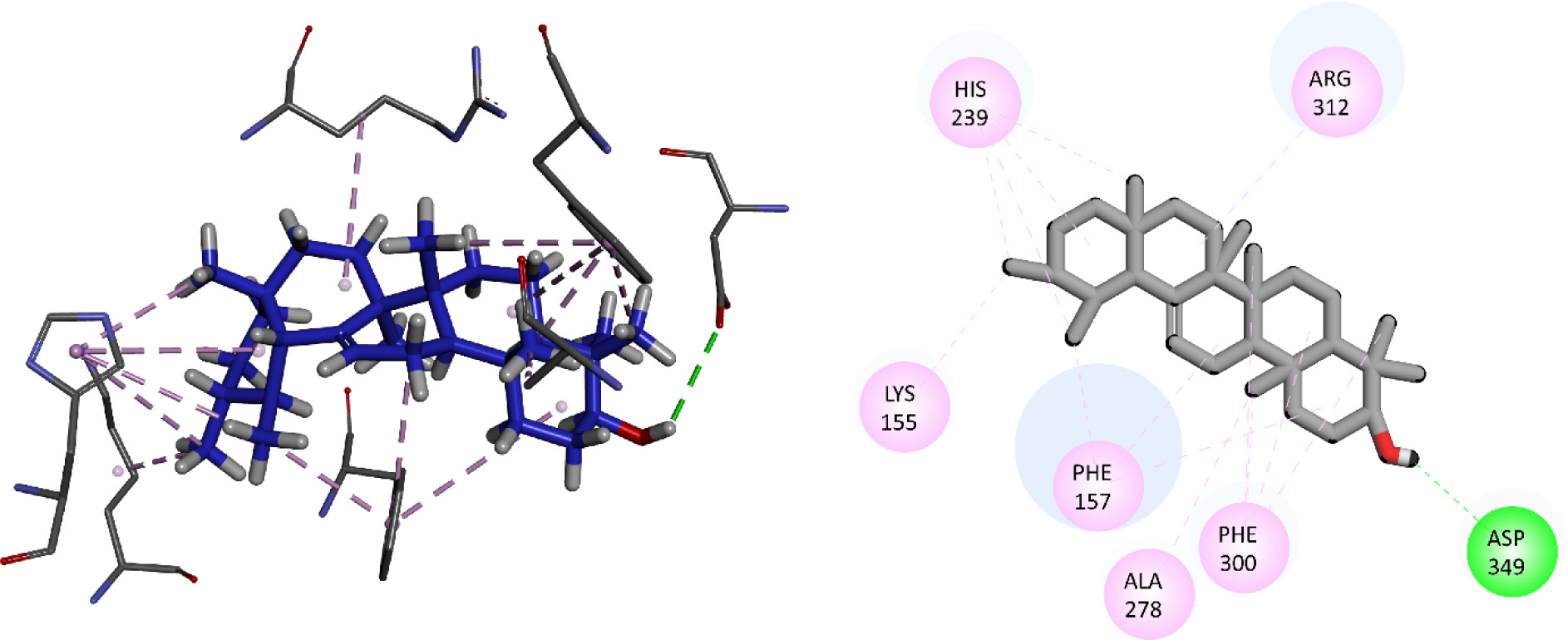 The interaction plots depicting the behavior of α-amyrin are shown in Figure 3. It establishes hydrogen bond interactions with Asp349. Moreover, aside from hydrogen bond interactions, Lys155, Phe157, His239, Ala278, Phe300, and Arg312 show pi-alkyl, alkyl interaction with a carbon atom of main structure. The computed binding energy value was -6.5857 kcal/mol. The interaction plots of androst-5-en-17-one and 3-methoxy-,17-methoximeare shown in Figure 4. His279 and Phe300 form interaction with π-Alkyl. It forms hydrogen bond interactions with Glu304, His239, Asp408, Phe157, and Arg312.