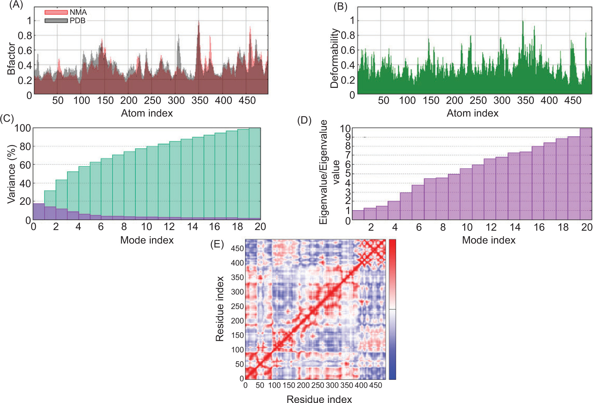 Figure 6. Molecular dynamic simulation results of α-amyrin with amylase enzyme (A-B) B-factor/mobility, (C) variance, (D) Eigen value, and (E) covariance map in which red color indicates the correlated data and white color indicates the uncorrelated data.