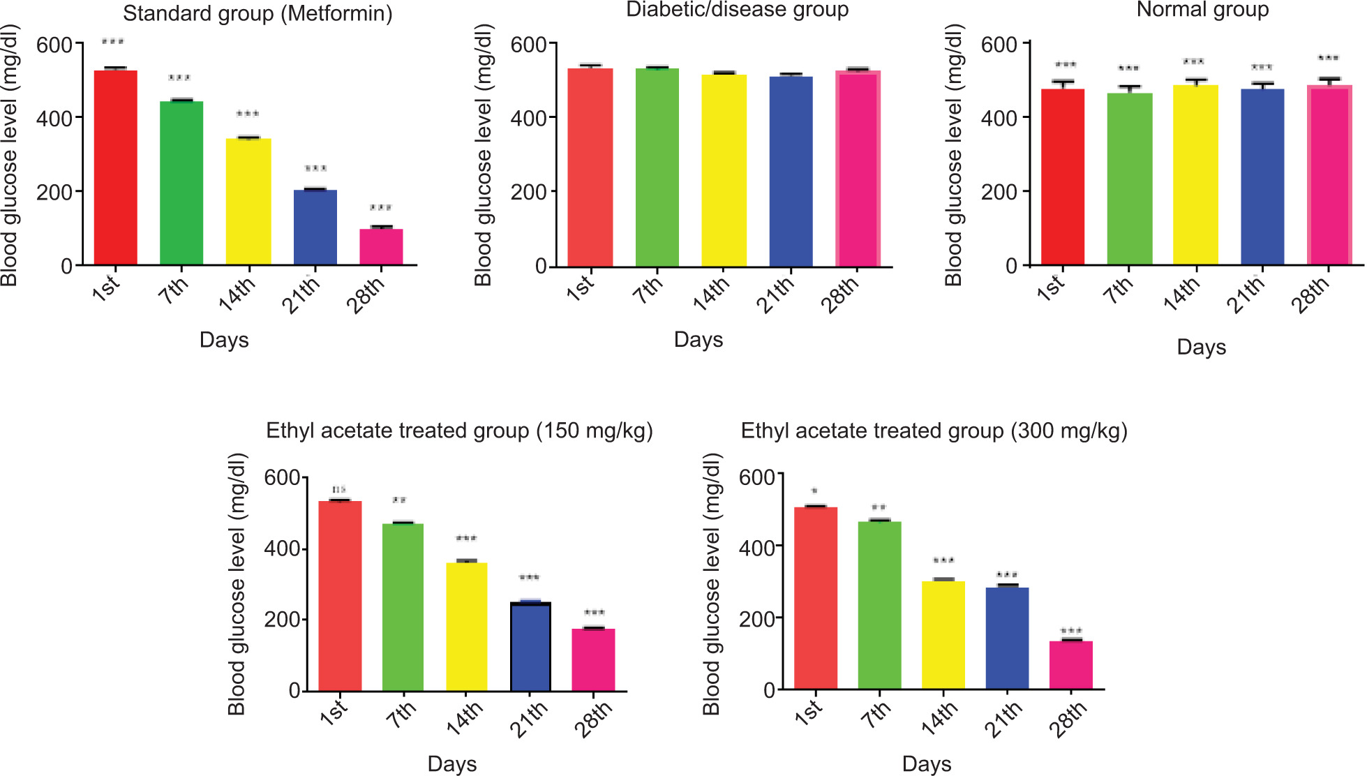 Following alloxan administration, diabetes in mice was confirmed by OGTT. Increase in blood glucose levels was noted in untreated diabetic group for different times, indicating the presence of diabetes. On days 7, 14, 21, and 28, the blood glucose levels were 510.33 mg/dL, 522.33 mg/dL, 515.16 mg/dL, and 522.83 mg/dL, respectively. The results obtained were compared to standard control group. Blood glucose levels decreased in mice given ethyl acetate extract at 150 mg/kg/day during the course of treatment. On day 1, the glucose level in blood was lowered to 512.16 mg/dL, 477.55 mg/dL, 359.45 mg/dL, and 254.88 mg/dL. Over the duration of 28 days, this decline persisted, reaching to 165.5 mg/dL on day 28. Blood glucose levels in mice treated with ethyl acetate fraction dose of 300 mg/kg/day also decreased significantly. The blood glucose level was 505.75 mg/dL on day 1, followed by 465.50 mg/dL on day 7, then 301.50 mg/dL on day 14, and 284.50 mg/dL and on day 21, it further decline to 131.75 mg/dL (Figure 7).