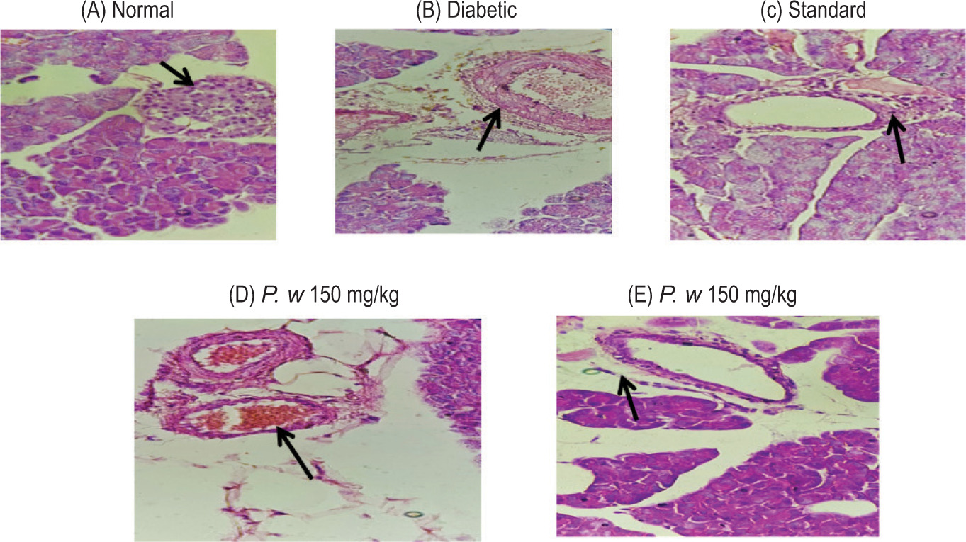 In control group, the pancreas showed normal acini and cellular population of the Islets of Langerhans. The diabetic group showed irregular and damaged Islets of Langerhans, as shown in Figure 8. The acarbose-treated group showed moderate increase in the size of islet cells and cellular population. No recovery of cellular organization and size of the Islets of Langerhans was observed, and there was no significant regenerative effect on the damaged pancreatic tissue in the group treated with a low dose. However, with a higher dose of P. wallichiana Pw.EtAc fraction cones (300 mg/kg/day), there was a partial restoration of cellular population and size of the Islets of Langerhans, which had a greater impact on the rejuvenation of β cells, compared to the lower dose.