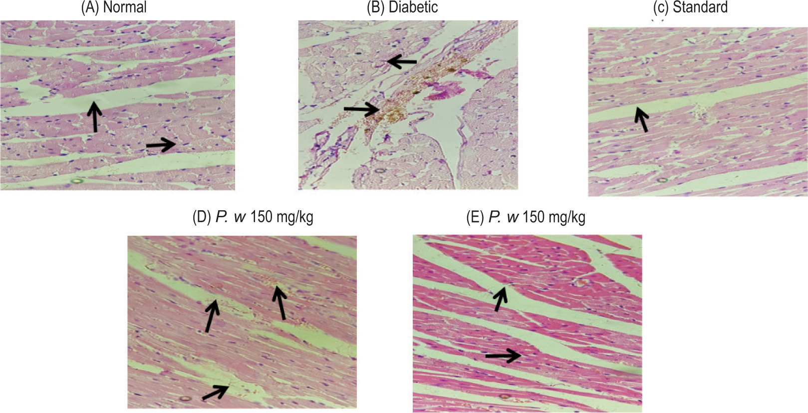The normal group of albino mice showed normal histology of the heart. The diseased diabetic group revealed severe injuries to the myocardium, and cellular infiltration, signifying inflammation in the heart tissue. In comparison to the diabetic group, the standard group’s cellular infiltration severity was significantly reduced. At low dose, cones extract showed no significant reduction in cellular infiltration, and myocarditis was observed. No modification was found in the heart tissue, revealing that a higher dose did not negatively impact heart histology, as shown in Figure 9.