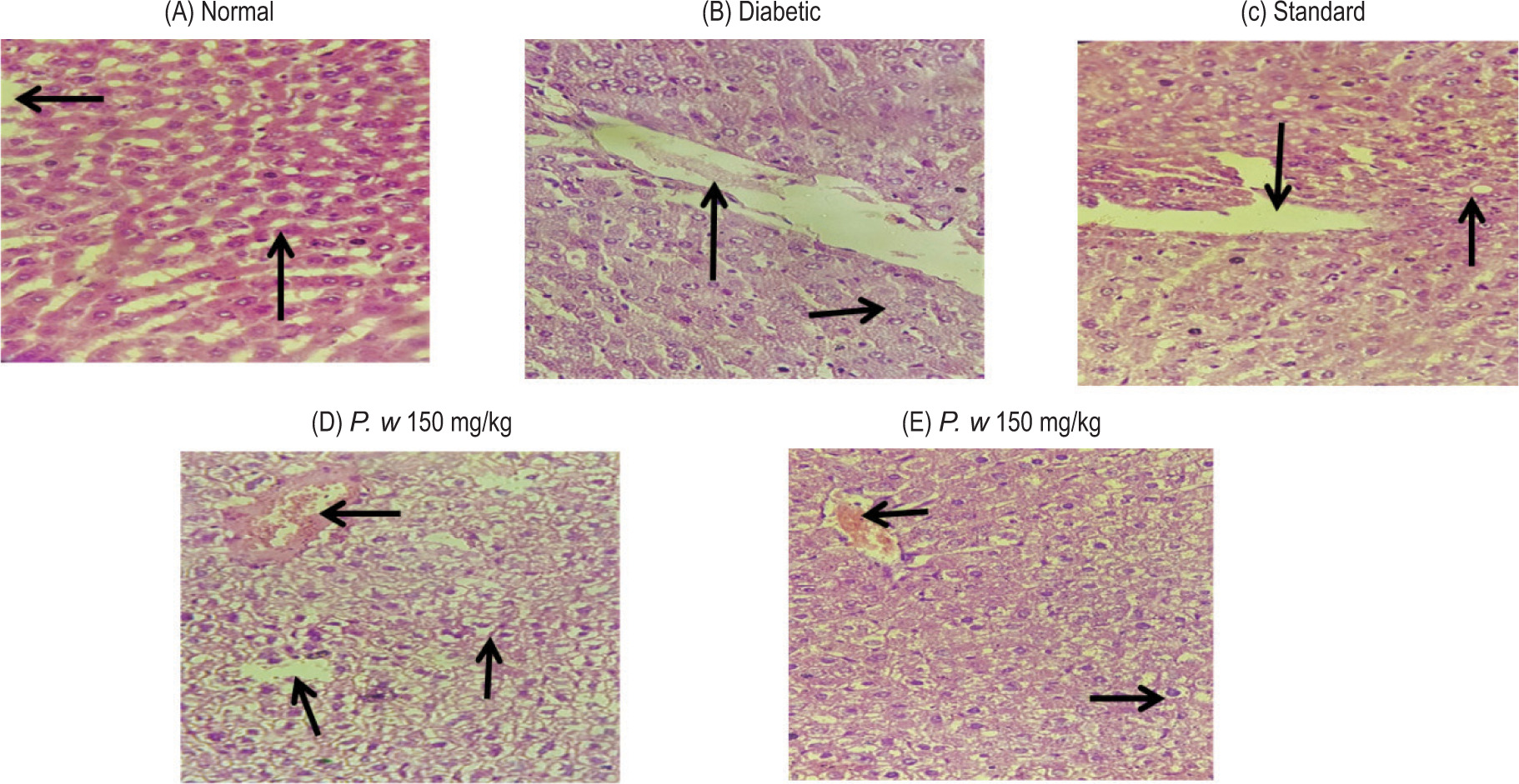 The liver exhibited normal hepatocytes and liver architecture in normal control group. Albino mice belonging to the diabetic group exhibited an increase in vacuolation within the cytoplasm of hepatocytes. These vacuoles were demarcated as vague, transparent vacuoles, which are usually a sign of diabetes-related glycogen invasion, as shown in Figure 10. After treatment with acarbose, hepatocytes and normal hepatic architecture showed normal restoration with few minor vacuolation of hepatocytes. The standard treatment had a positive effect with some persisted glycogen infiltration. The group treated with 150 mg/kg showed hepatocytes restoration, dilated central vein but did not prevent glycogen infiltration. In another group treated with high dose showed a slightly dilated central vein with normal hepatic architecture and hepatocytes with slight glycogen infiltration.