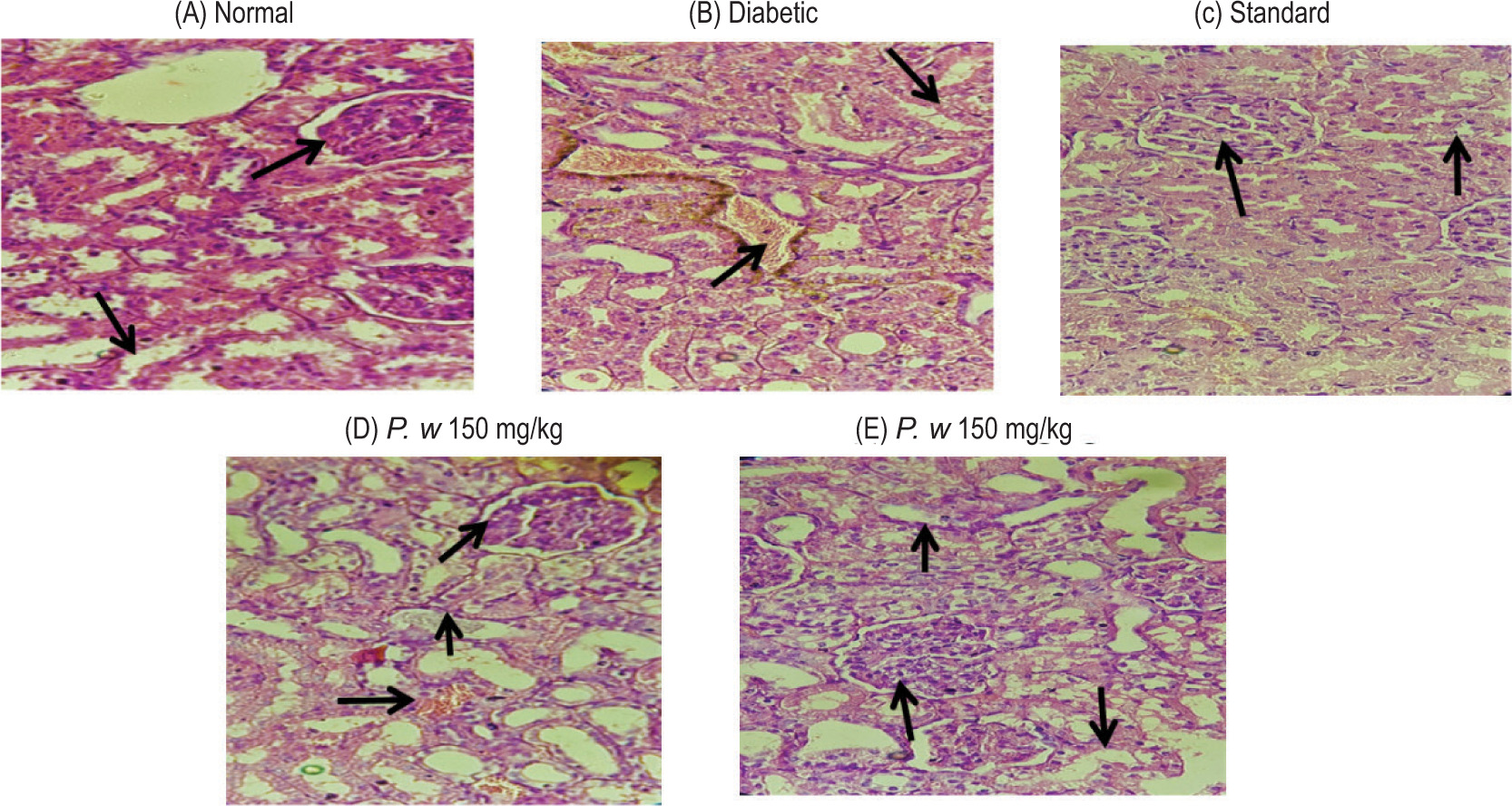 | Vital organs | Acarbose, 5 mg/kg | Normal control | Diabetic control | Pw.EtAc 150 mg/kg | Pw.EtAc 300 mg/kg |