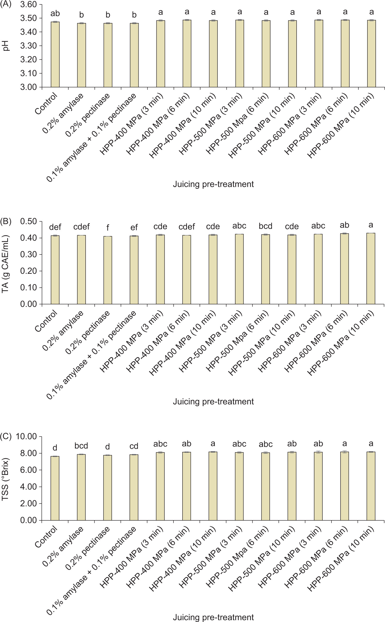 Figure 2. Effect of different juicing pre-treatments using high-pressure processing (HPP) and enzyme maceration on the pH, titratable acidity (TA), and total soluble solids (TSS) of jaboticaba juice.