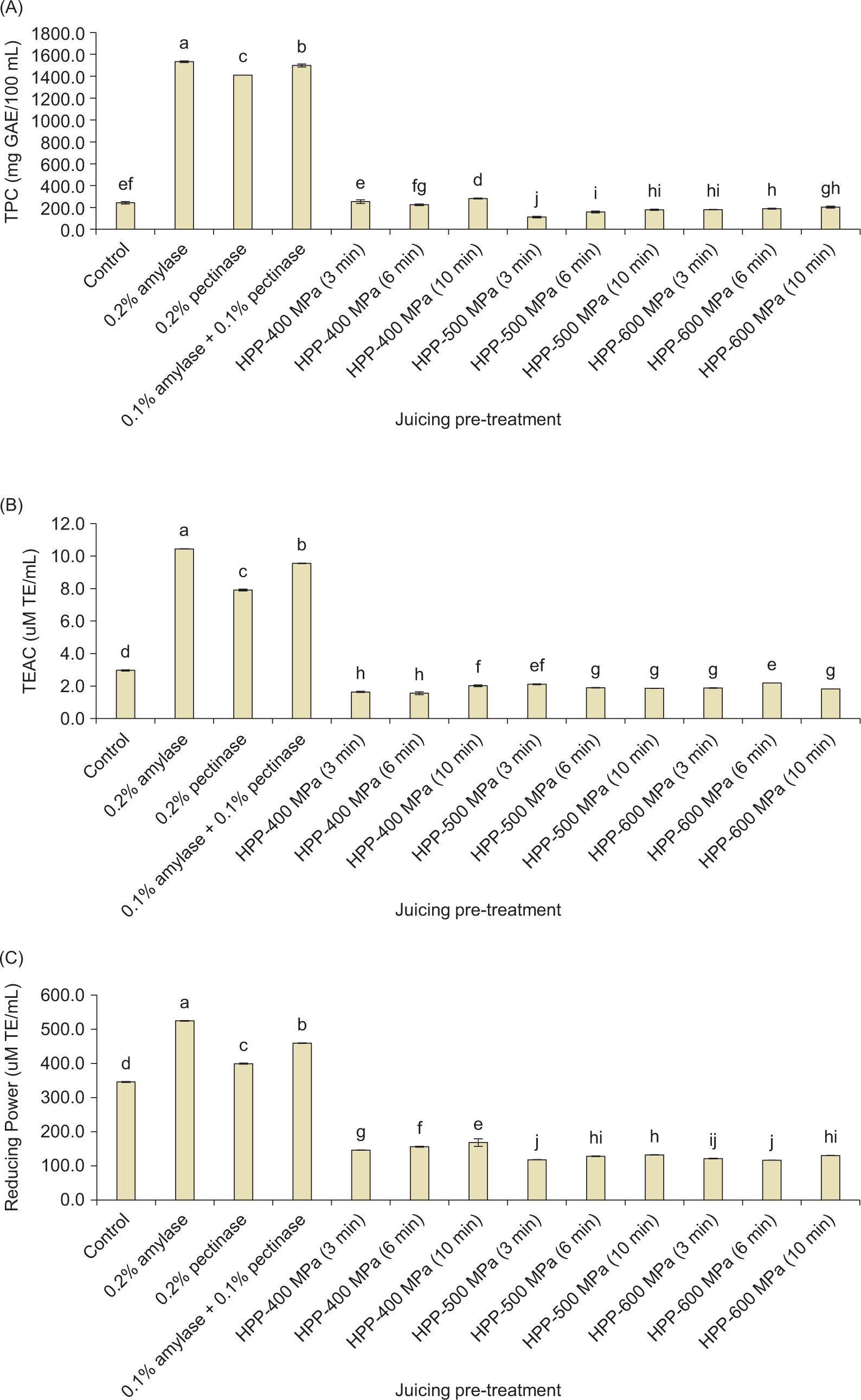 Figure 4. Effect of different juicing pre-treatments using high-pressure processing (HPP) and enzyme maceration on (A) total phenolic content (TPC), (B) Trolox equivalent antioxidant capacity (TEAC), and (C) ferric reducing antioxidant power (FRAP) of jaboticaba juice.